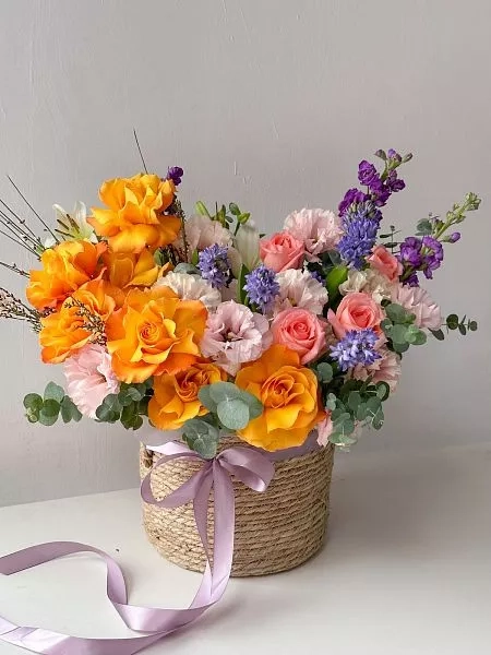 Flower bouquet "Orange sunset" with hyacinth, lisianthus and rose
