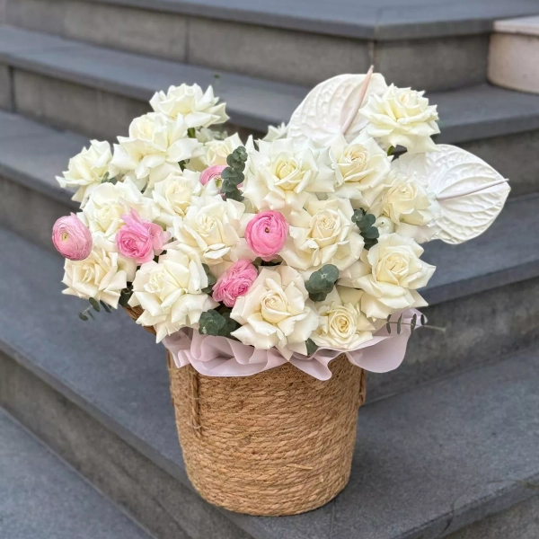 Flower basket "Scarlett" with anthurium, rose and ranunculus